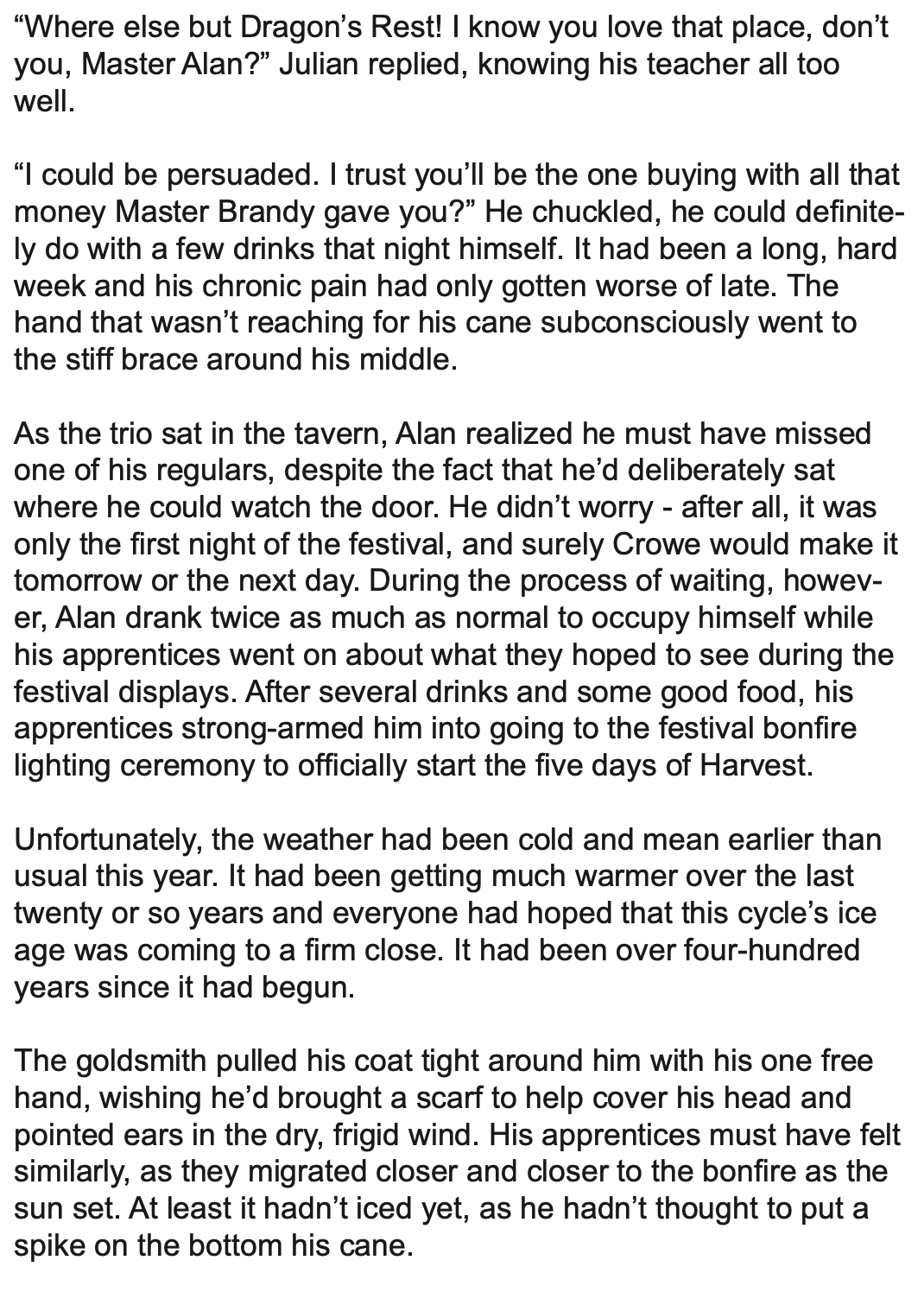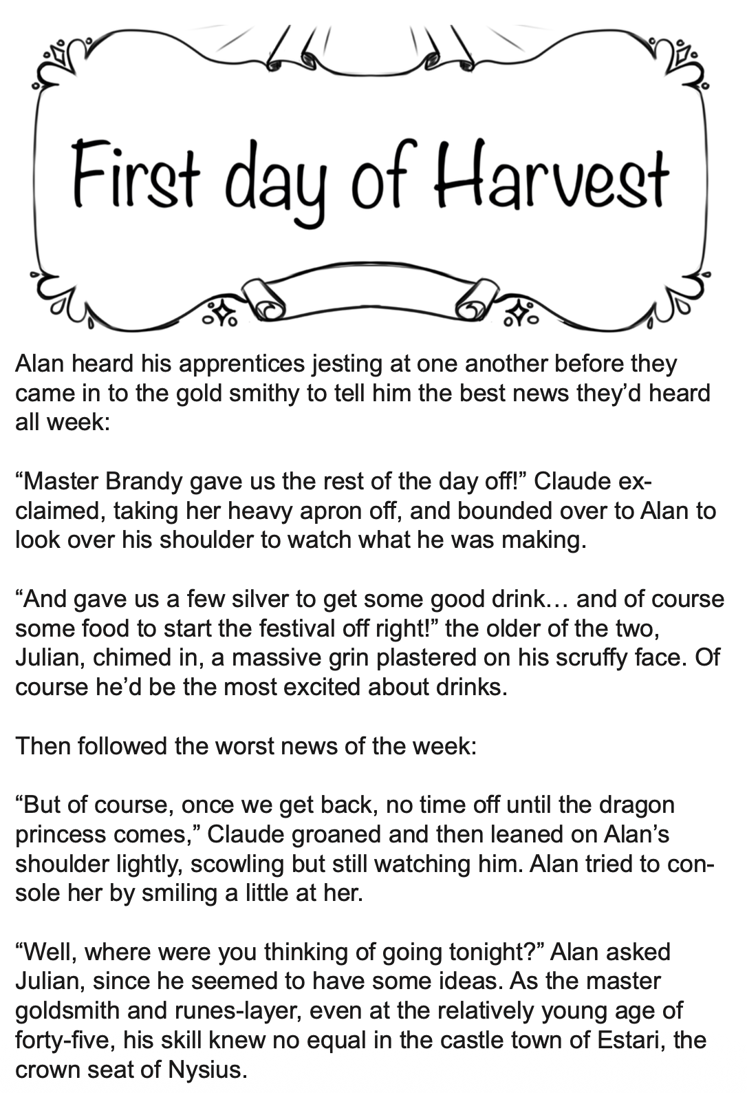 Alan's life had always been rather unremarkable; as a master goldsmith and runes-layer, wielding magic had always been beyond his grasp - until things get turned upside down the very first night of Harvest when he saves his oldest apprentice from a fiery grave. What starts with an event he tries to move past turns into a personal journey filled with royal intrigue, late night trysts, and the start to his confrontation of his traumatic past that left him physically and mentally scarred. This queer dark fantasy story follows Alan as he tries to uncover the true nature of the miraculous healing magic he didn't even know he was capable of as he begins to learn that not all is as it seems.